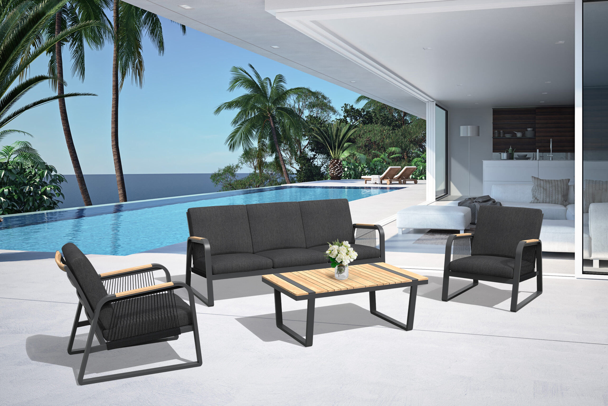 Hochwertiges Gartenmóbel-Lounge-Set aus Aluminium-Teak. Pulverbeschichtetem Aluminium kombiniert mit Teakholz. Bestehend aus 1x Sofa 186,5x68x87cm 2x Stuhl 89x71x87cm, 1x Tisch 117,5x70x46cm und wasserabweisenden Polyesterkissen. Die Armlehnen und die Tischplatte bestehen aus Teakholz. Sitzhöhe 45cm, Sitztiefe 56cm.Entspricht der Artikel nicht den Wünschen des Kunden, besteht kein Rückgaberecht und die Verantwortung liegt allein beim Kunden. Transportschäden müssen auf dem Frachtbrief des Fahrers vermerkt werden und wir empfehlen, das Produkt immer sowohl außen als auch in der Verpackung zu fotografieren. Der Endverbraucher sollte das Paket immer öffnen, wenn der Fahrer noch anwesend ist, um eine schnelle Kontrolle zu machen!