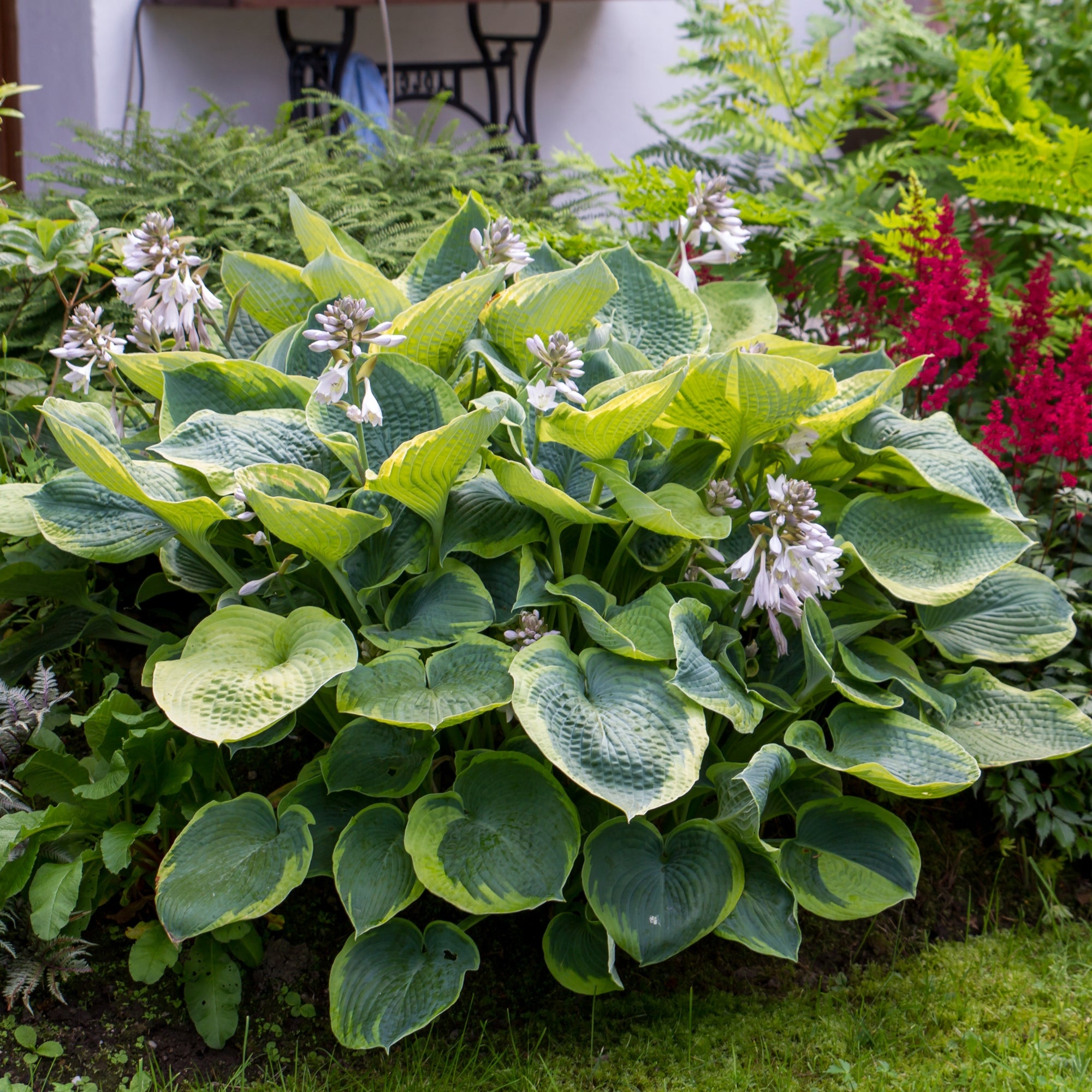 Die Blaue Gelbrand-Funkie ‚Frances Williams‘ (Hosta sieboldiana ‚Frances Williams‘) kann mit Recht als eine Blattschmuckpflanze bezeichnet werden. Die herzförmigen, ganzrandigen Blätter entwickeln eine schöne blau-grüne Farbe mit auffälligem, gelbem Rand. Als sommergrüne Staude verliert sie ihre Blätter im Herbst, färbt sie vorher aber noch in schönes Gelb. Von Juli bis August kommen die violetten Blüten dazu. Die Blaue Gelbrand-Funkie ‚Frances Williams‘ wächst horstbildend, buschig und breit und wird dadurch bis zu 80 cm hoch und 80 cm breit. In Staudenbeeten fügt sie sich gut ein.
