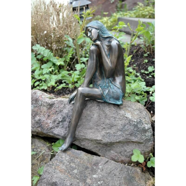 Bronzeskulptur Emanuelle Die Figur Emanuelle ist eine sehr schön, von Hand gearbeitete Bronzeskulptur. Die Bronzefigur, die eine verträumte, junge Dame darstellt, ist bereits mit einer schmucken Patina versehen. Eine stilvolle und romantische Dekoration für Haus und Garten. Die Bronzeskulptur wird ohne Steinstele geliefert, kann aber auch mit Stele bestellt werden. Größe* Höhe: 40 cm Breite: 12 cm Tiefe: 18 cm *Bei den handgearbeiteten Bronzefiguren sind Differenzen bei den Abmessungen und der Patina in gewissen Toleranzen unvermeidlich. Jede Figur ist ein handgearbeitetes Unikat, hergestellt in Deutschland. Allgemeine Information zur Geschichte und Herstellung der Figuren, zu Bronze allgemein und auch zur Pflege von Bronzeskulpturen haben wir Ihnen unter der Rubrik Informationen zu Bronzeskulpturen zusammengefasst.
