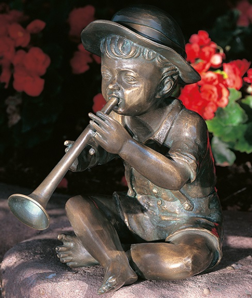 Bronzeskulptur Philipp, wasserspeiend Die flötenspielende Figur Philipp ist eine sehr schön, von Hand gearbeitete wasserspeiende Bronzeskulptur. Die Bronzefigur ist bereits mit einer schmucken Patina versehen, somit fügt sich die Figur stilvoll in Ihren Garten oder Ihre Teichanlage ein. Besonderheit der Figur ist der Wasserspeier, der in der Flöte eingebaut ist. Stein, Pumpe, Schlauch und Wasserwanne sind im Lieferumfang nicht enthalten, Lieferung erfolgt versandkostenfrei. Größe* Höhe: 28 cm Breite: 16 cm Tiefe: 28 cm *Bei den handgearbeiteten Bronzefiguren sind Differenzen bei den Abmessungen und der Patina in gewissen Toleranzen unvermeidlich. Jede Figur ist ein handgearbeitetes Unikat, hergestellt in Deutschland. Allgemeine Information zur Geschichte und Herstellung der Figuren, zu Bronze allgemein und auch zur Pflege von Bronzeskulpturen haben wir Ihnen unter der Rubrik Informationen zu Bronzeskulpturen zusammengefasst. Informationen zum Aufbau der Wasserspeier: 1. Kupfer-Steigleitung Jede wasserspeiende Figur führt im Innern eine Kupferrohrleitung aus einem speziellen Legierung als Wasser-Steigleitung (Figur zu Demozwecken geöffnet). 2. Wasseranschluß Je nach Figur hat die Steigleitung einen Durchmesser von 1/2 oder 3/4 Zoll. 3. Diebstahlsicherung Jede Figur ist mit zwei bzw. vier Laschen für Gewindestifte versehen, mit welchen diese diebstahlsicher angebracht werden kann. 4. Kernbohrung Im Findling (Zubehör) verläuft die von außen unsichtbare Kernbohrung durch die dann der PVC-Schlauch gezogen wird. 5. PVC-Schlauch Als Wasserführung von der Pumpe zur Figur steckt er Unsichtbar im Findling (Zubehör). 6. Kunststoffbecken und Abdeckplatte Passende Becken finden Sie im Fachhandel 7. Pumpe Passende Pumpen finden Sie im Fachhandel