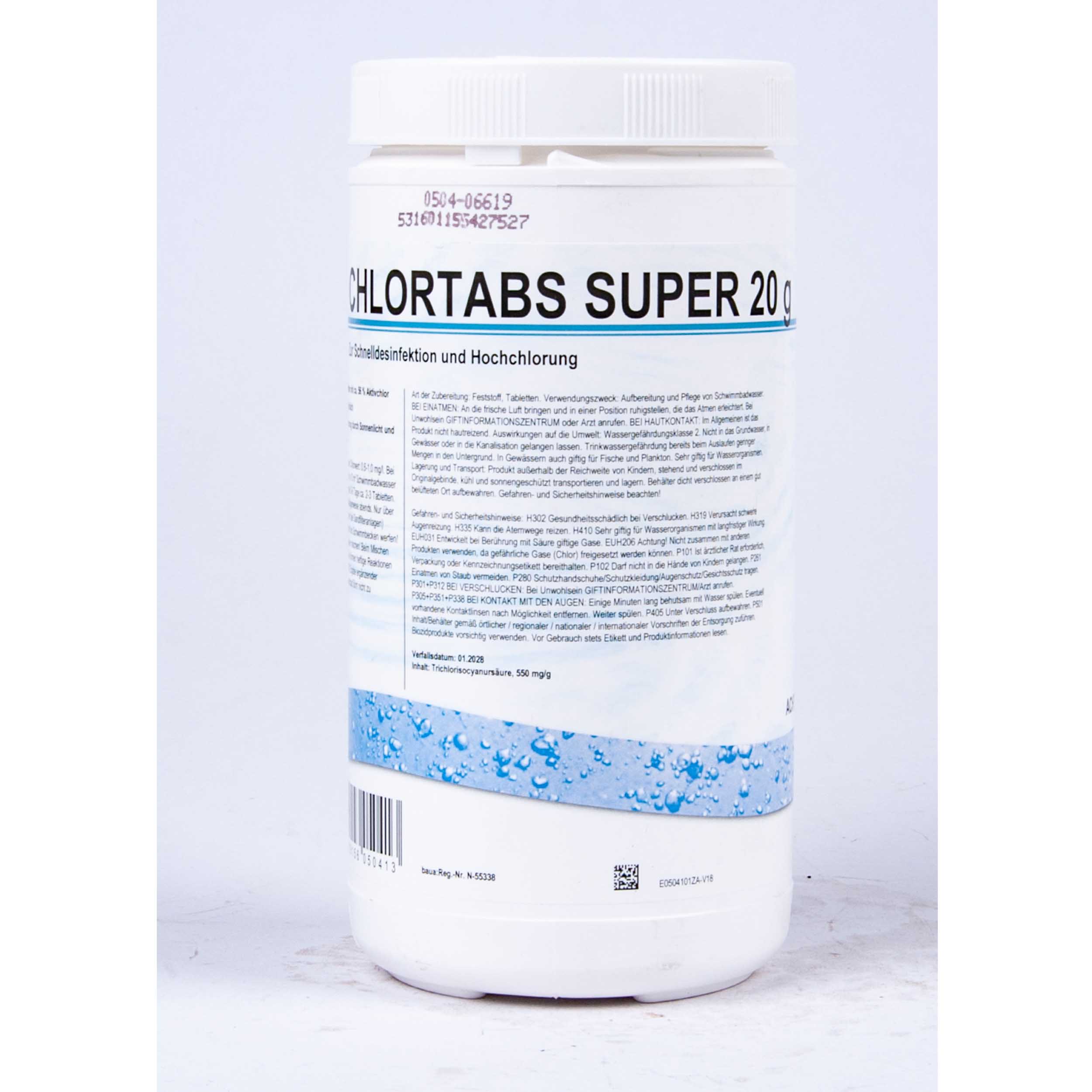 Chlortabs-Super 1 kg – 20g Tabletten zur schnellen PooldesinfektionDie Chlortabs-Super 20g Tabletten in der praktischen 1-kg-Dose bieten eine effektive und unkomplizierte Lösung für die Sofort-Desinfektion Ihres Poolwassers. Sie wirken schnell, zuverlässig und sorgen für dauerhaft klares, hygienisches Wasser in Pools und Schwimmbecken.Schnell wirksames Chlor für hygienische WasserqualitätDie schnell löslichen 20g-Tabletten eignen sich besonders zur Stoßchlorung bei akuten Problemen mit Algen, Trübungen oder erhöhter Belastung des Poolwassers. Ideal auch zur regelmäßigen Nachchlorung kleiner bis mittelgroßer Pools, Planschbecken oder Whirlpools.
