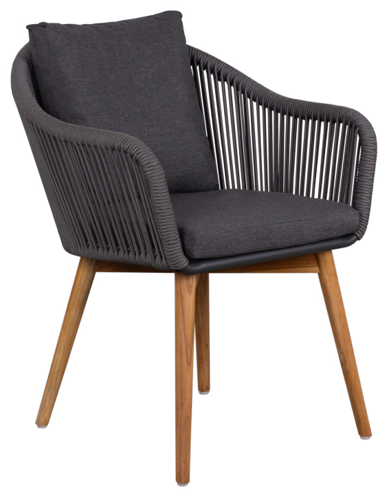 Abende im Freien werden noch schöner, wenn Komfort und Design harmonieren. Ob auf der Terrasse, im Garten oder auf dem Balkon – der Diningsessel Solana Rope dark grey inkl. Kissen uni grey schafft einen stilvollen Rahmen für entspannte Stunden unter freiem Himmel. Sein moderner Ausdruck, geprägt von klaren Linien und natürlichen Farbtönen, fügt sich mühelos in verschiedene Outdoor-Gestaltungen ein und begleitet jede Begegnung im Grünen mit einer angenehmen, ruhigen Ästhetik. Design, Materialien & Verarbeitung Der Diningsessel Solana kombiniert einen pulverbeschichteten Aluminiumrahmen mit fein verarbeiteten Teakholzbeinen und schafft so eine wertige Mischung aus Leichtigkeit und natürlicher Wärme. Die luftdurchlässige Rope-Bespannung im dunklen Grau sorgt für ein modernes Erscheinungsbild und sitzt dank reißfestem und schnelltrocknendem Material zuverlässig und formstabil. Die Armlehnen sind so konzipiert,