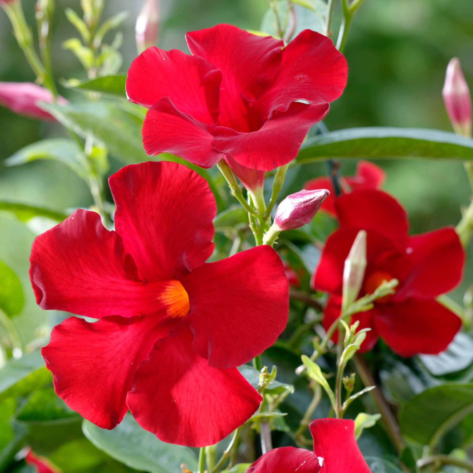 Die Dipladenia ‚Sundaville®‘ ist eine beeindruckende Kübelpflanze, die Ihren Garten, Balkon oder Ihre Terrasse mit ihren leuchtend roten Blüten und glänzenden, sattgrünen Blättern bereichert. Die trompetenförmigen Blüten verleihen Ihrem Außenbereich einen exotischen Touch, und dank ihrer enormen Blühfreudigkeit können Sie sich von Mai bis Oktober über eine stetige Blütenfülle freuen. Die Lieferung erfolgt ohne Übertopf.