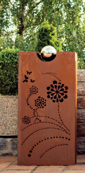 Edelrost Dekosäule Rhombus 4 Blumen, ohne Schale Schön gearbeitete Deko Säule aus Edelrost, mit einer Edelstahl Kugel als Kontrast Element. Das Muster der Säule ist mit 4 Blumen und Schmetterlingen versehen. Die Unterseite der Säule ist offen und eignet sich hervorragend zur Innenbeleuchtung durch Bodenstrahler. Die Mischung aus Edelstahlkugeln und Rost macht dieses Produkt zu etwas Besonderem. Die Säule gibt es in drei verschiedenen Ausführungen, einzeln oder als Set. Größe: Höhe: 120 cm Breite: 60 cm Tiefe: 20 cm Deutsche Qualitätsarbeit, hergestellt in Handarbeit