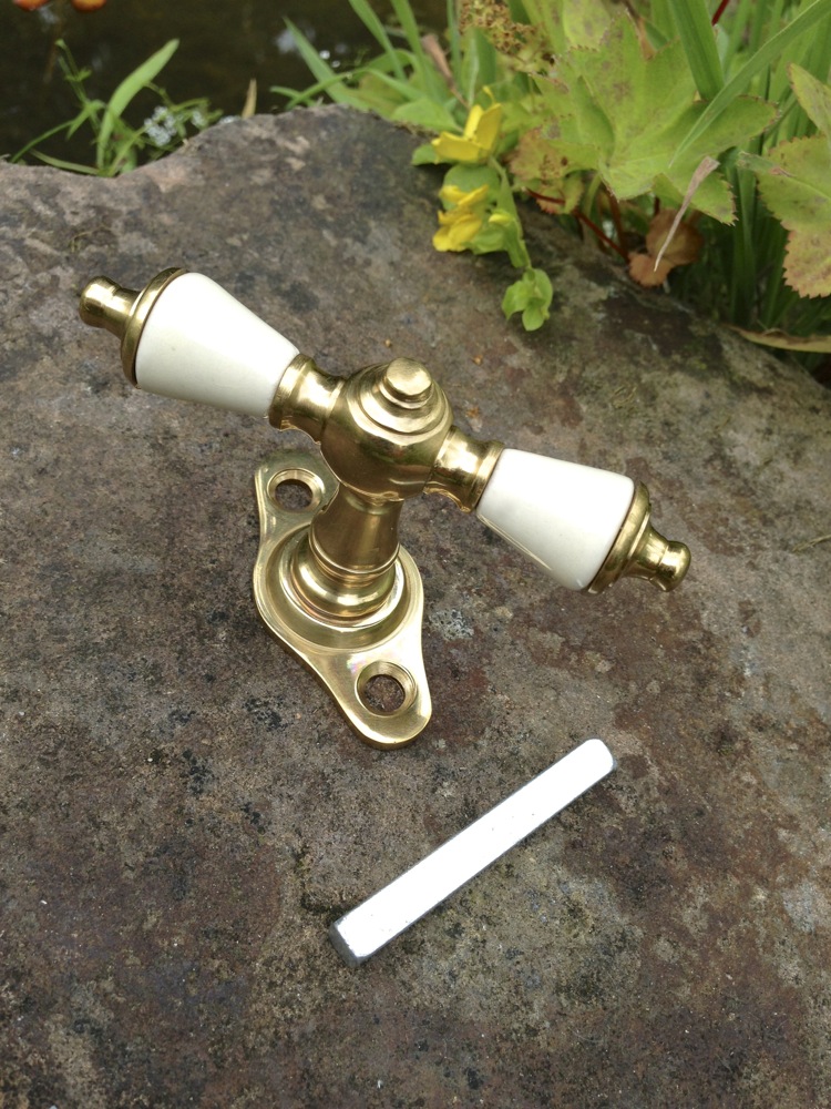 Klassische Jugendstil / Gründerzeit Fenstergriffe Messing poliert. Griffstücke Porzellan altweiß . Ausführung Messing poliert.
