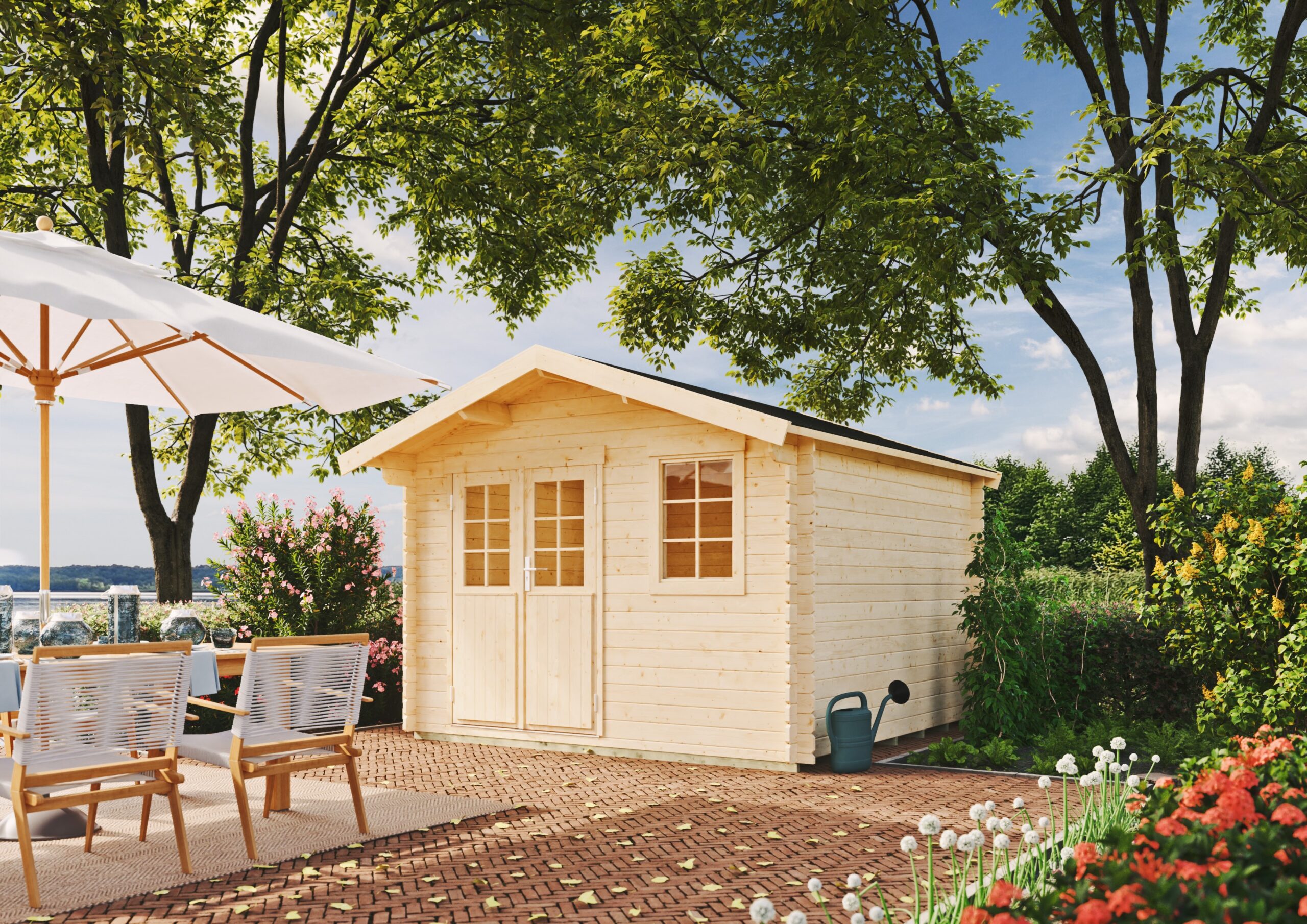 Das Gartenhaus Chester 3,00 × 3,00 m von Finnia Gartenwelt ist ein klassisches und zugleich äußerst vielseitiges Blockbohlenhaus, das mit seiner robusten Bauweise jeden Außenbereich bereichert. Gefertigt aus hochwertigem, langsam gewachsenem nordischem Fichtenholz und mit einer Wandstärke von 28 mm ausgeführt, bietet es Ihnen eine langlebige und stabile Lösung für Garten, Hobby, Lagerung oder Freizeitnutzung. Die Blockbohlen sind CNC-präzise vorgefertigt, was eine perfekte Passgenauigkeit und einen reibungslosen Aufbau ermöglicht, und das massive Holz ist technisch getrocknet sowie chemisch unbehandelt – ideal für individuelle Oberflächenbehandlungen und Anstriche nach Ihren Wünschen. Die Wände werden klassisch in stabiler Stapelbauweise montiert, sodass sie durch wechselnde Witterungsbedingungen „arbeiten“ können, ohne an Dichtigkeit zu verlieren. Das flache Dach mit einer 2°-Neigung, 16 mm starken Nut- und Federdachbrettern und Massivholzpfetten verleiht dem Haus ein modernes Erscheinungsbild. Vorinstallierte Tür- und Fensterelemente mit Doppel-Holztür und Echtglas-Fenster sorgen für eine einladende Atmosphäre und viel Tageslicht im Innenraum. Ein robuster Fußboden mit 16 mm Stärke, hochwertige Beschläge, praxisgerechte Drückergarnituren sowie komplettes Montagematerial sind bereits im Lieferumfang enthalten, sodass der Aufbau schnell und unkompliziert gelingt. Mit einer Grundfläche von 9 m², Seit- und Firsthöhen von 2,05 m bzw. 2,10 m und einer natürlichen Holzoptik schafft dieses Gartenhaus eine funktionale und stilvolle Ergänzung für jeden Garten.