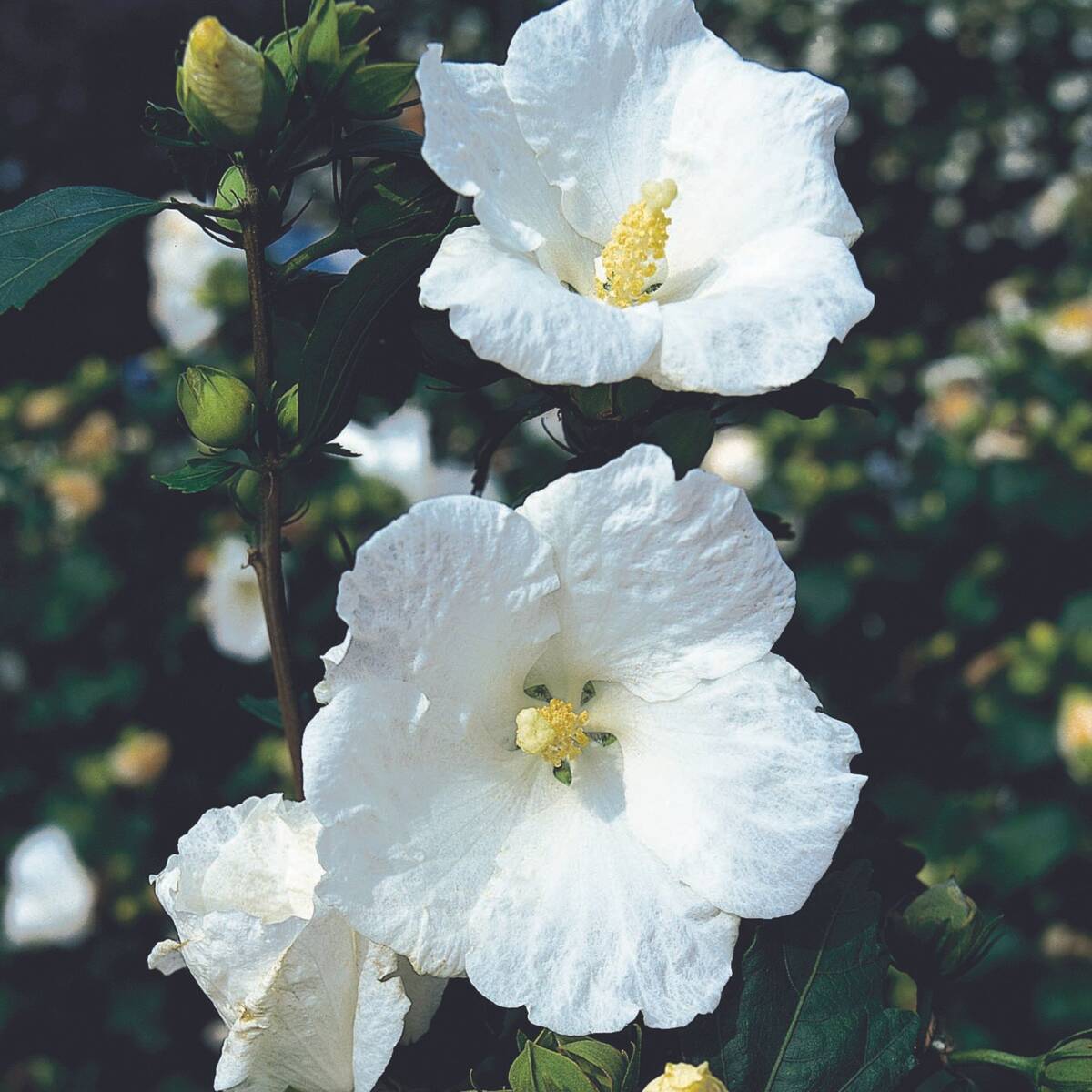 Der Gartenhibiskus (Hibiscus syriacus) ist ein sommergrüner Strauch, der einen aufrechten Wuchs aufweist. Bis zu 3 m Höhe und 1,5 m Breite kann er damit erreichen. Sein Blätterkleid besteht aus mittelgrünen, eiförmigen Blättern mit gelapptem Rand. Im Herbst nehmen diese gelbe Farbtöne an. Von Juli bis September trägt er schalenförmige, weiße Blüten. Damit ist er nicht nur ein Blickfang, sondern auch eine interessante Nahrungsquelle für viele Insekten. Hinweis: Das Bild zeigt ein Farbbeispiel – das tatsächliche Produkt kann in der Farbe variieren.