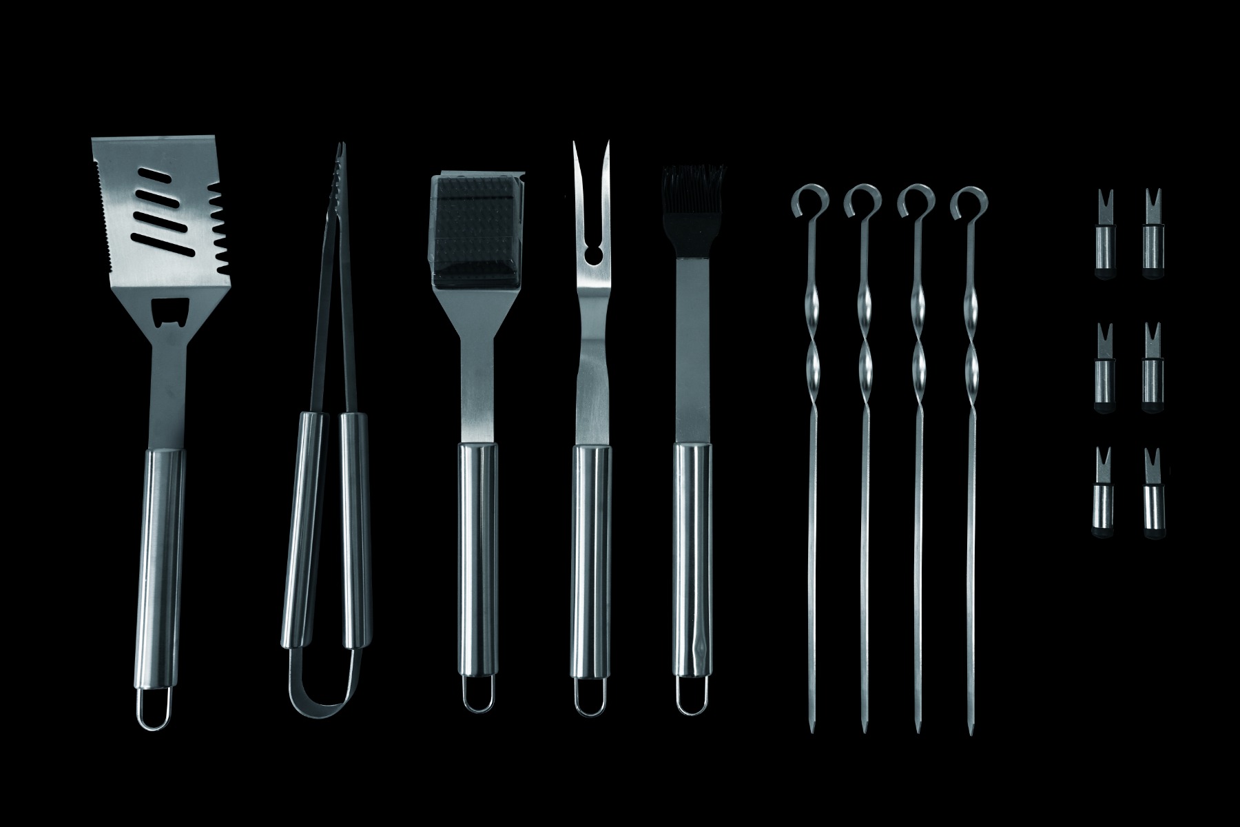 Genießen Sie das Grillen noch besser mit diesem luxuriösen BBQ-Grillwerkzeug-Set. Enthält einen Aluminiumkoffer, um sie aufzubewahren. Aus hochwertigem Edelstahl. Das Werkzeug hat lange Griffe für zusätzliche Sicherheit und sorgt dafür, dass Ihre Hände der Hitze nicht zu nahe kommen. Das Set besteht aus 1x Zange, 1x Spachtel, 1x Gabel, 1x Reinigungsbürste, 6x Maishalter und 4x Spießen + Koffer.