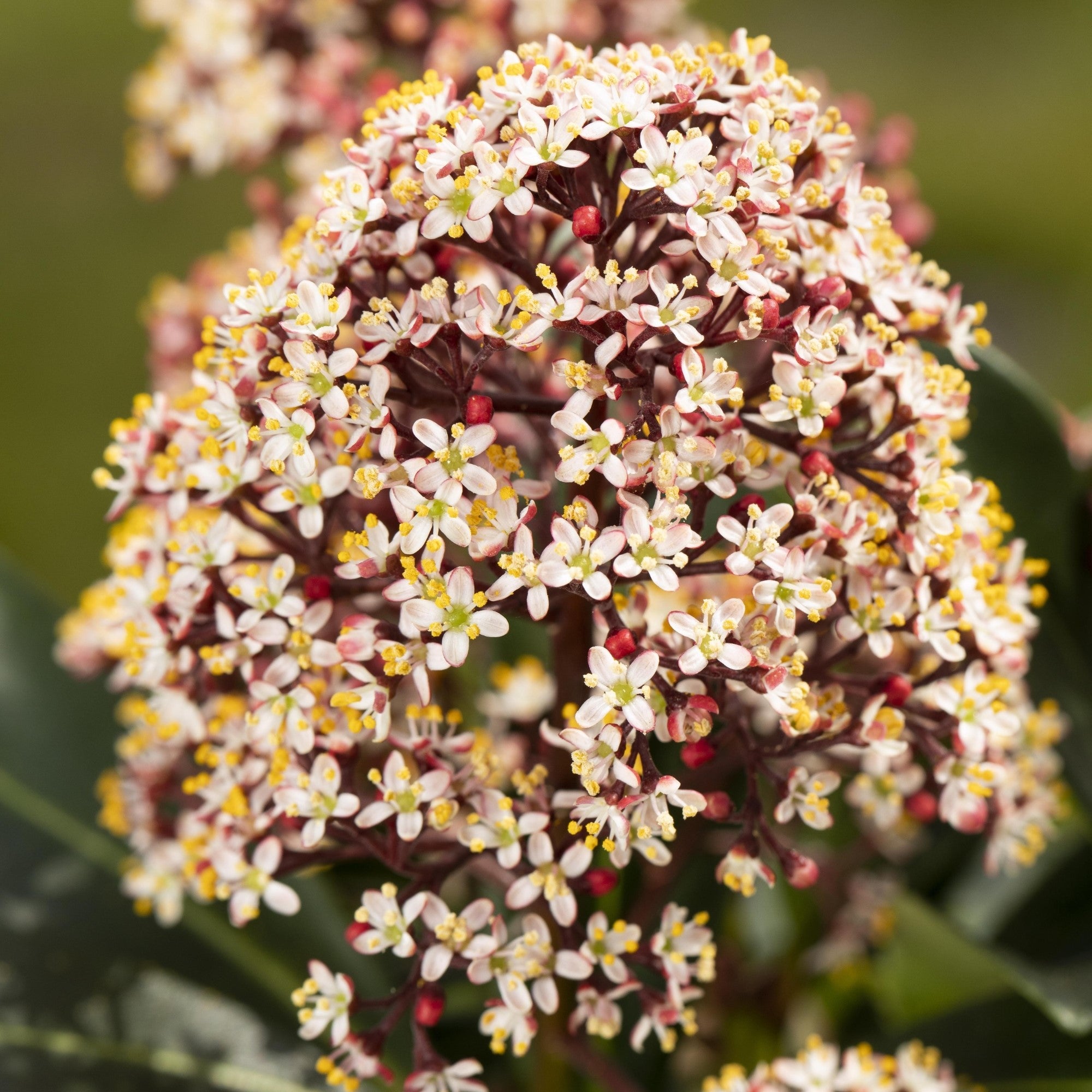Verleihen Sie Ihrem Garten, Balkon oder Ihrer Terrasse auch im Winter einen besonderen Reiz – mit der Japanischen Blütenskimmie ‚Rubella‘ (Skimmia japonica ‚Rubella‘). Dieser kompakte, immergrüne Zierstrauch begeistert Gartenfreunde mit seiner außergewöhnlichen Winter- und Frühjahrswirkung. Im Herbst erscheinen die dekorativen, tiefroten Blütenknospen, die den ganzen Winter über an den Zweigen stehen und farbige Akzente in der dunklen Jahreszeit setzen. Im Frühjahr – meist im April und Mai – entfalten sich daraus dichte, aufrechte Blütenrispen mit zahlreichen weiß-rosafarbenen Einzelblüten, die wie kleine Sternchen wirken. Ihr zarter Duft lockt Bienen und Hummeln an. Die Japanische Blütenskimmie ‚Rubella‘ wächst dicht verzweigt, rundlich bis aufrecht und bleibt mit rund einem Meter Höhe angenehm kompakt – ideal für kleinere Gärten, schattige Beete oder als dekorative Kübelpflanze. Ihre dunkelgrünen, glänzenden Blätter erinnern an Lorbeer und bilden einen stilvollen Kontrast zu den zarten Blüten. Auch in Gruppenpflanzungen ist sie ein attraktiver Hingucker – dabei sollten nicht mehr als drei bis vier Exemplare pro Quadratmeter gesetzt werden. In Kombination mit Rhododendren, Heidepflanzen oder filigranen Gräsern entstehen harmonische Gartenbilder mit Struktur und Farbe – selbst im Winter. Pflege: Die Japanische Blütenskimmie ‚Rubella‘ liebt einen halbschattigen bis schattigen, windgeschützten Standort. Als Moorbeetpflanze bevorzugt sie humose, lockere und leicht saure Böden – ideal ist Rhododendronerde. Halten Sie den Boden gleichmäßig feucht, vermeiden Sie jedoch Staunässe. In Trockenzeiten sowie zur Blütezeit ist regelmäßiges Gießen wichtig. Gedüngt wird im Frühjahr mit einem Moorbeetdünger. Ein Rückschnitt ist nicht nötig, verblühte Rispen können im späten Frühling entfernt werden. Die Pflanze ist winterhart bis -20 °C. Bei Kübelhaltung empfiehlt sich Winterschutz und gute Drainage. Bei Gruppenpflanzung setzen Sie idealerweise 3–4 Pflanzen pro Quadratmeter. Mit minimalem Pflegeaufwand schenkt Ihnen ‚Rubella‘ ganzjährig dekorative Knospen, frisches Grün und zarte Frühlingsblüten.