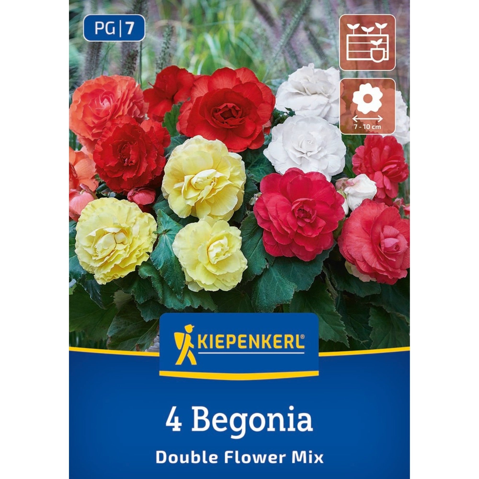 Die Kiepenkerl Knollenbegonie ‘Gefüllte Mischung’ ist eine vielseitige Blumenzwiebel‑Auswahl mit prächtigen, gefüllten Blüten und außergewöhnlicher Sommerwirkung. Nach dem Frühjahrspflanzen entwickeln sich aus den Knollen kompakte Pflanzen, die durch ihre reich gefüllten Blüten Ihren Garten, Balkon oder Terrassentopf in ein farbenfrohes Blütenmeer verwandeln. Die Mischung kombiniert unterschiedliche Strukturen und Blütenformen und sorgt über Wochen für eine lebendige, stimmige Pflanzwirkung, die besonders in Beeten, Rabatten oder Pflanzgefäßen zur Geltung kommt. Pflege: Pflanzen Sie die Knollenbegonien im April oder Mai, sobald keine Frostgefahr mehr besteht, an einen halbschattigen bis schattigen Standort mit durchlässigem, humosem Boden. Die empfohlene Pflanztiefe beträgt etwa 8–10 cm, und ein Abstand von rund 30 cm zwischen den Pflanzen gibt jedem Exemplar genügend Raum, um sich gut zu entwickeln. Halten Sie den Boden während der Wachstums‑ und Blütezeit gleichmäßig feucht, vermeiden Sie jedoch Staunässe. Knollenbegonien sind nicht winterhart – im Herbst sollten die Knollen ausgegraben und frostfrei überwintert werden, damit sie im nächsten Jahr wieder blühen.