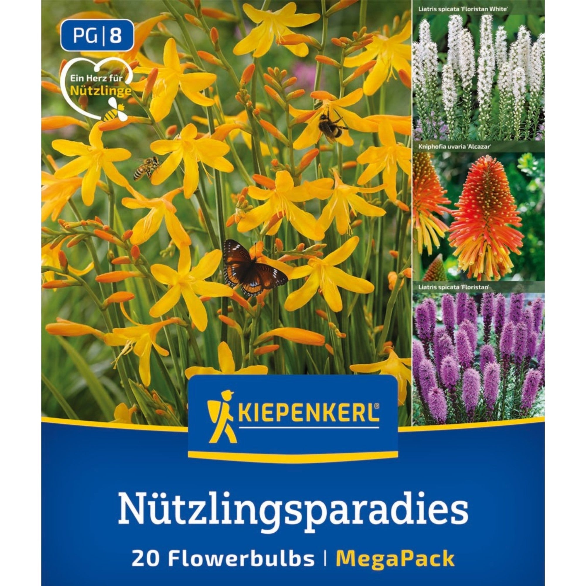 Die Kiepenkerl Mega‑Pack Blumenzwiebelmischung ‚Nützlingsparadies‘ ist eine vielseitige Zusammenstellung sommerblühender Blumenzwiebeln, die von Juli bis in den Herbst eine abwechslungsreiche Blütenpracht schaffen. Sie besteht aus Fackellilien, Montbretien und Prachtscharten, die in unterschiedlichen Blütenformen und -größen wachsen und zusammen ein lebendiges Blumenbild ergeben. Die Pflanzen entwickeln sich zu unterschiedlich hohen Standorten im Beet, in Rabatten oder in größeren Pflanzgefäßen und sorgen für sichtbare Farbe und Struktur im Garten. Für gesundes Wachstum empfehlen sich ein sonniger bis halbschattiger Standort, ein durchlässiger Boden und regelmäßiges Gießen. Vor dem Pflanzen gewässerte Zwiebeln treiben oft schneller und kräftiger aus. Pflege: Pflanzen Sie die Zwiebeln im April oder Mai, sobald keine Frostgefahr mehr besteht, in gut durchlässigen Boden mit ca. 10 cm Pflanztiefe und etwa 50 cm Abstand zwischen den Zwiebeln. Ein sonniger bis halbschattiger Standort unterstützt eine gleichmäßige Blüteentwicklung. Halten Sie den Boden während der Wachstums‑ und Blütezeit gleichmäßig feucht, vermeiden Sie aber Staunässe. Regelmäßiges Gießen und gelegentliches Düngen fördern kräftige Pflanzen und reichhaltige Blüten. Die Mischung ist mehrjährig, sodass Sie sich über wiederkehrende Pflanzwirkung freuen können, wenn die Zwiebeln im Boden verbleiben.