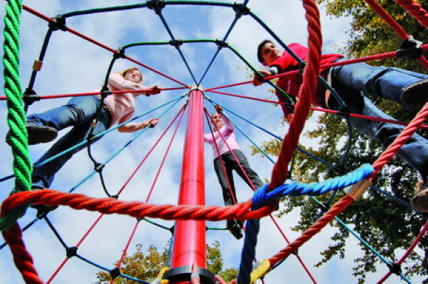 Kletterpyramide 750cm bei Intergard kaufen?Kletternetz Klettergerüst Kletterpyramide Spielplatzpyramide für Spielplätze Schulhof, mehrfarbiges Seil stahlverstärkt 16mm. Mast feuerverzinkt 8,35m, Durchmesser 10,40m, Sicherheitsbereich Durchm. 14,40m, maximale Fallhöhe 2m. TÜV-geprüft für öffentliche Spielgeräte und Spielplätze.