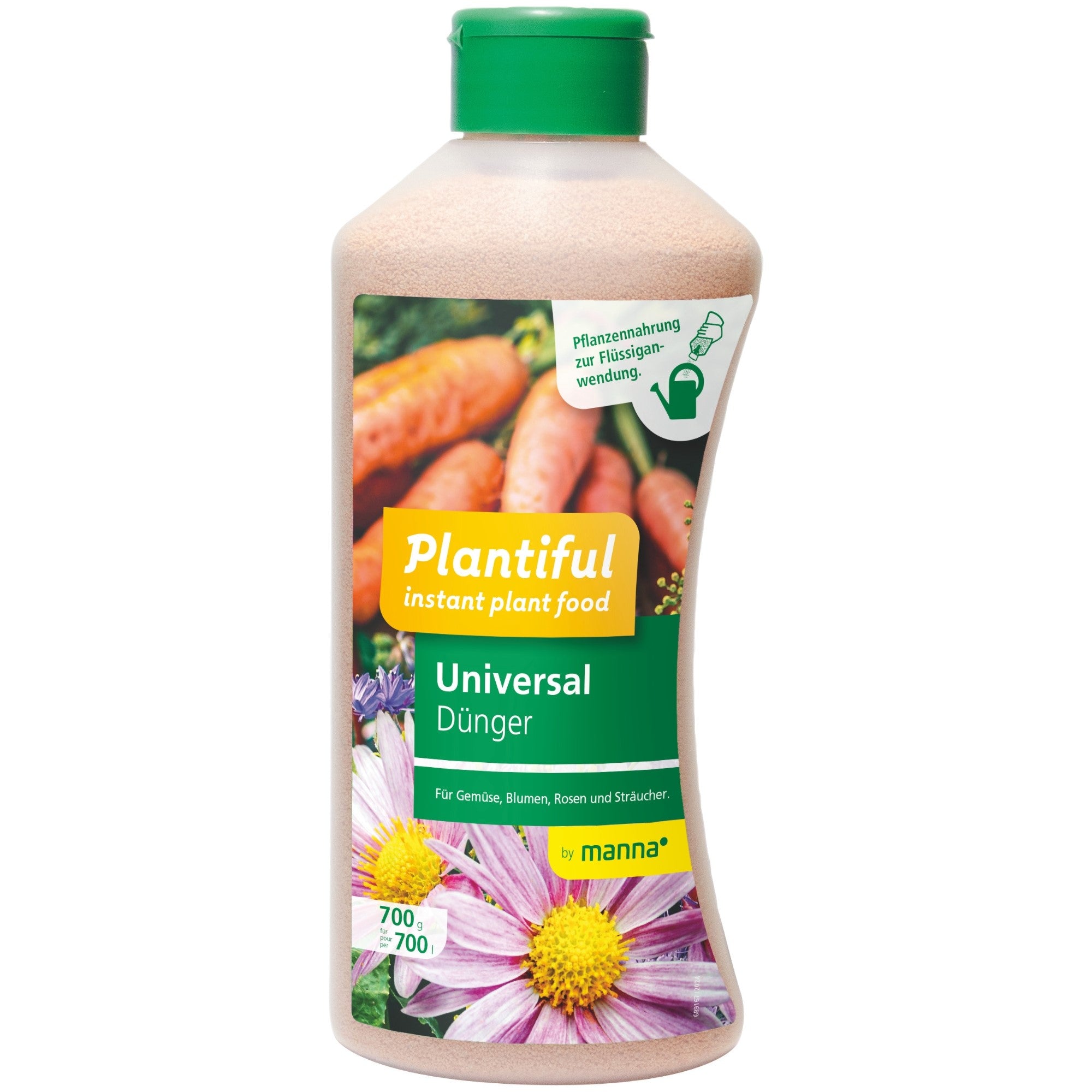 Die Plantiful Instant-Pflanzennahrung Universal ist die ideale Wahl, um eine gesunde und kräftige Pflanzenentwicklung in Ihrem Garten zu fördern. Der Plantiful Dünger besteht aus wasserlöslichen Solupearls® und wird erst zu Flüssigdünger, wenn er zu Wasser hinzugegeben wird. So können die Nährstoffe mit Gießwasser gemischt schnell und effektiv von den Pflanzen aufgenommen werden und eine Packung reicht bis zu 40 % weiter als herkömmlicher Flüssigdünger. Das integrierte Dosiersystem ermöglicht eine einfache Anwendung ohne Auskristallisierung, Verkleben am Flaschenhals oder Dosierfehler. Je nach Fassungsvermögen der Gießkanne wird die Flasche einmal oder mehrfach gedreht und die richtige Menge gelangt direkt in die Kanne. So dosieren Sie richtig – ganz ohne umfüllen oder abmessen. Im Vergleich zu herkömmlichen Flüssigdüngern ermöglicht Plantiful mehr Nährstoffkombinationen, die eine umfassende und ausgewogene Versorgung Ihrer Pflanzen sicherstellen. Zusätzlich ist Plantiful besonders nachhaltig: Es wird kein Wasser transportiert, was Ressourcen schont, und durch die 40 % höhere Reichweite wird deutlich weniger Verpackungsmaterial benötigt. Die ausgewogene Nährstoffzusammensetzung fördert ein gleichmäßiges, kräftiges Wachstum, sodass Gemüse, Blumen, Rosen, Sträucher, Gehölze und Beeren in voller Pracht erblühen. Magnesium, Eisen und weitere wichtige Spurenelemente verhindern Mangelsymptome effektiv, sodass Ihre Pflanzen immer vital und gesund bleiben. Egal, ob im Beet, auf dem Balkon oder im Garten – mit Plantiful Instant-Pflanzennahrung erhalten Ihre Pflanzen alles, was sie für ein gesundes und schönes Wachstum benötigen. Anwendung: 1) Flasche drehen und dosieren Vor dem Gebrauch die verschlossene Flasche einmal auf den Kopf drehen und wieder zurückstellen. Schon ist die Menge für eine Anwendung im Dosierkopf bereit. 2) Granulat einfüllen Drehen Sie die Flasche erneut und lassen Sie das Granulat direkt in Ihre Gießkanne rieseln. 3) Füllen Sie Wasser auf und lassen Sie es auflösen Füllen Sie nun die Gießkanne mit Wasser, wobei sich das Granulat sofort auflöst. 4) Pflanzen gießen Gießen Sie anschließend Ihre Gemüse, Blumen, Rosen, Sträucher, Gehölze oder Beeren wie gewohnt mit der angereicherten Düngerlösung. Dosierung: Integriertes Dosiersystem: 1x drehen = 4-5l Gießwasser. Einmal wöchentlich während der Vegetationszeit anwenden. Bei Wachstumsproblemen bis zu zweimal pro Woche gießen. Hinweise: Flasche nach Gebrauch gut verschließen und vor Feuchtigkeit geschützt lagern. Bei einem verstopften Dosiersystem den Deckel abschrauben, das Granulat mit einem Holzstab lösen und die Gießkanne ggf. mit heißem Wasser ausspülen. Anschließend gut trocknen lassen. Sollte sich das Granulat in der Gießkanne nicht vollständig auflösen, einfach umrühren.