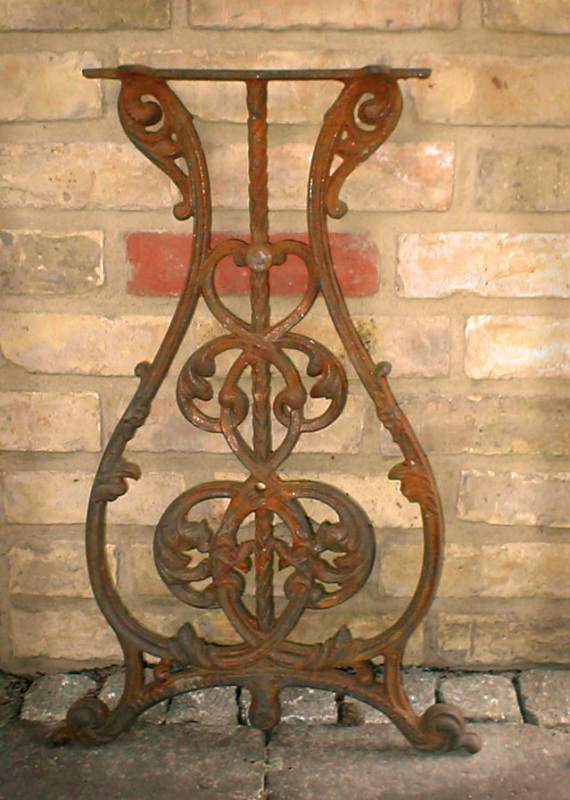 Diese Nähmaschinentisch – Seitenteilen aus der Gründerzeit sind aus Gusseisen gefertigt und mit einer malerischen Rost-Patina behaftet. So sind sie draussen wetterbeständig.
