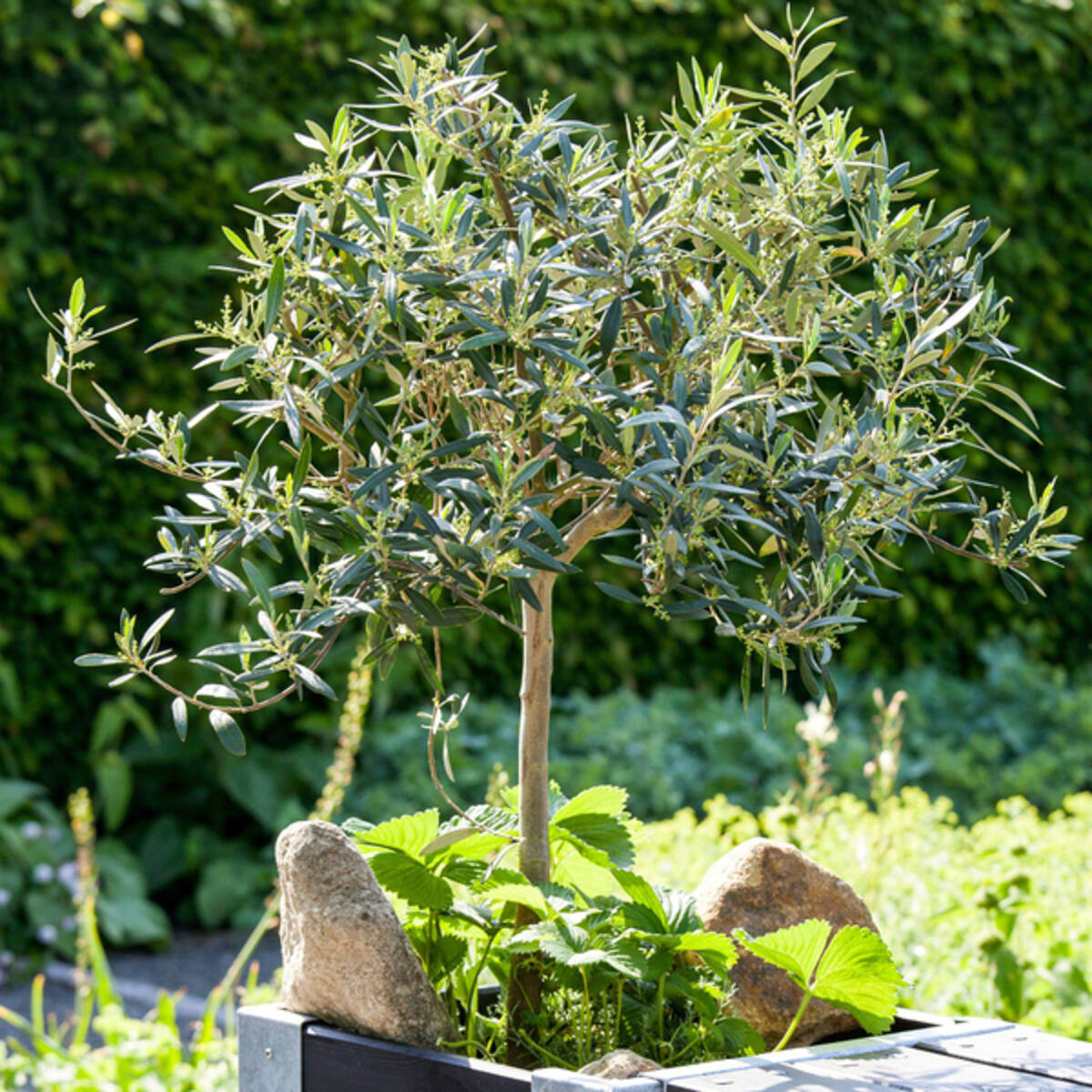 Der Olivenbaum, ein Symbol mediterraner Landschaften, bringt das ganze Jahr über südländisches Flair in Ihren Garten oder auf Ihre Terrasse. Mit seinem silbrig-schimmernden Laub strahlt er auch im Winter Eleganz und Anmut aus, was ihn zu einer idealen Garten- und Kübelpflanze macht. Dieser Baum erinnert an sonnige Urlaubstage, weiße Strände und gemütliche Abende mit gutem Essen und Wein. Im Sommer schmückt sich der Olea europaea mit einer Vielzahl duftender Blüten, aus denen ab August die beliebten Olivenfrüchte entstehen. Die Lieferung erfolgt ohne Übertopf.