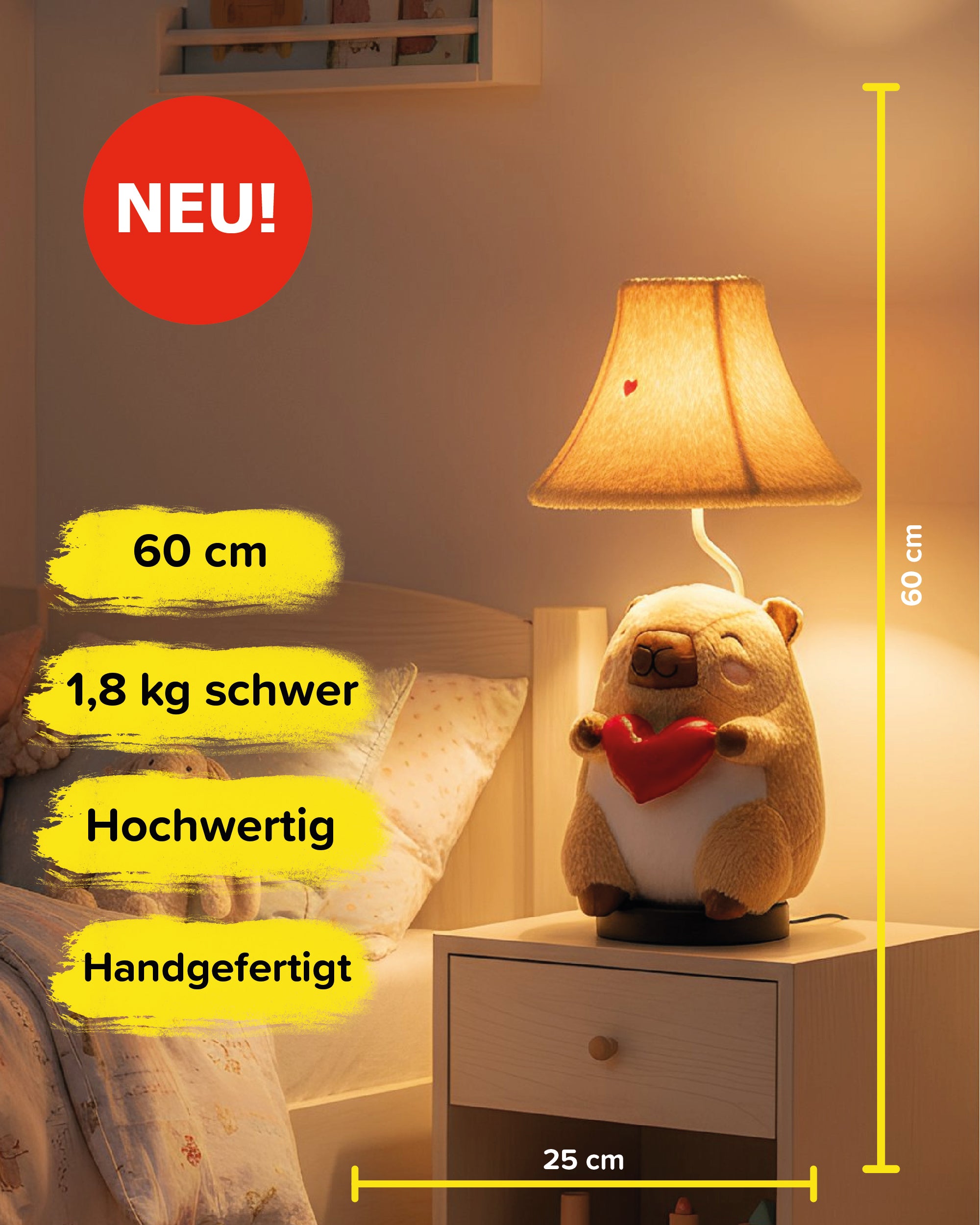 Otto ist nicht einfach nur ein Capybara – er ist ein echter Herzensbrecher! Mit seinem kuschelweichen Fell, den sanften Augen und dem strahlend roten Herz in den Pfoten bringt er Wärme und Geborgenheit in dein Zuhause. Ob als Geschenk für einen lieben Menschen oder als liebevolle Erinnerung an dich selbst – Otto erinnert dich täglich daran, wie schön es ist, geliebt zu werden.. Sein rundes, gemütliches Wesen, die rosigen Bäckchen und sein friedlicher Gesichtsausdruck machen Otto zu einem echten Seelentröster. Er strahlt Ruhe, Liebe und ein ganz großes Herz aus – und genau das hält er auch fest in den Händen.. Das macht Otto besonders. Otto wird aus besonders weichem Plüsch gefertigt, ergänzt durch liebevoll gearbeitete Details aus hochwertigem veganem Kunstleder. Sein knuffiger Körper, die feinen Stickereien im Gesicht und das leuchtend rote Herz machen ihn zu einem Hingucker, der nicht nur Kinderherzen höherschlagen lässt.. Der mit flauschigem Stoff überzogene Lampenschirm trägt ein kleines rotes Herz – ein subtiler Hinweis auf Ottos große Botschaft: Liebe und Wärme gehören in jedes Zuhause.. Einsatzgebiet. Otto passt einfach überall hin: auf den Nachttisch, ins Kinderzimmer, auf ein Regal im Wohnzimmer oder ins Büro. Überall dort, wo ein bisschen mehr Liebe und Licht gefragt ist, ist Otto genau richtig. Auch als Geschenk zur Geburt, zum Valentinstag oder einfach als Zeichen der Freundschaft ist er ein echtes Highlight.. Happy Lamps. Unsere Happy Lamps im Stofftierlook sind nicht nur charmant, sondern auch sicher: Sie werden mit viel Liebe zum Detail in Handarbeit gefertigt und sind vom renommierten Testinstitut Hansecontrol zertifiziert.. In unserem Onlineshop findest du Otto und viele weitere tierisch liebevolle Charaktere, die dein Zuhause nicht nur erhellen, sondern mit Freude und Gefühl füllen. Willkommen in der Happy Family!