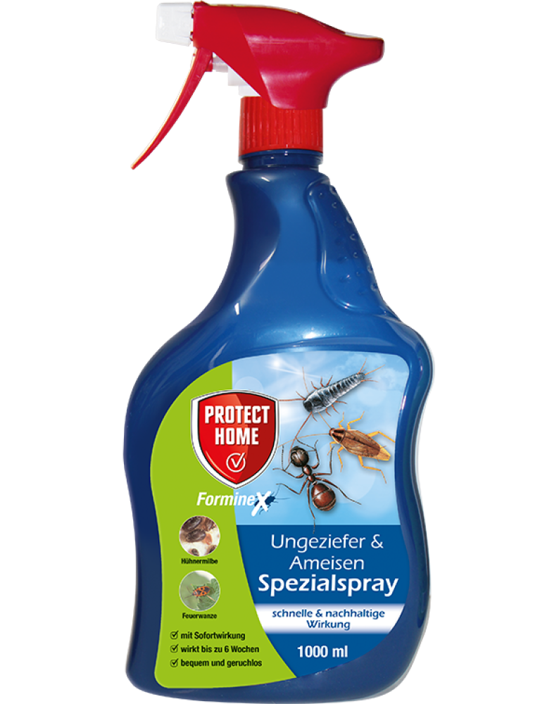 PROTECT HOME Ungeziefer&Ameisen Spezial-Pumpspray Es ist eine neue Durchführungsverordnung für den Kauf von Bioziden in Kraft getreten. Biozid-Produkte dürfen nur noch nach einer Beratung abgegeben werden. Bitte geben Sie unbedingt bei der Bestellung Ihre Rückrufnummer mit an. Anwendungsbereich: Gegen Ungeziefer und Lästlinge im und am Haus (z.B. Terrassen, Hauswände, Kelleraufgänge und -schächte, Gartenhäuschen, Garagen, Geräteschuppen etc.). Das Produkt wirkt hervorragend gegen Wanzen (z.B. Feuerwanzen), Milben (z.B. Vogelmilben, Grasmilben, Erntemilben, Herbstmilben) und andere unerwünschte Spinnentiere (z.B. Spinnen, Taubenzecken, Holzbock etc.), aber auch gegen Ameisen, Kellerasseln, Silberfischchen, Schaben und Heimchen. Kann zudem zur direkten Behandlung von fliegenden Insekten, wie zum Beispiel Wespen, eingesetzt werden (zur Nestbehandlung bitte Bayer Garten Spezial-Spray oder Wespenschaum verwenden). Biozide sicher verwenden. Vor Gebrauch stets Kennzeichnung und Produktinformation lesen. Produkteigenschaften: Seit über 30 Jahren bewährter Wirkstoff, der europaweit eingesetzt wird Gebrauchsfertiges Pumpspray zur schnellen und einfachen Anwendung Wirkt schnell und lang anhaltend bis zu 3 Monaten Sofortwirkung bei direktem Ansprühen der Insekten Barrierewirkung: Insekten nehmen den Wirkstoff auf und gehen nach wenigen Minuten ein Geruchlos, da keine organischen Lösemittel oder Treibmittel enthalten sind Frei verkäuflich Wirkstoffe 0,153 g/l Deltamethrin Anwendung: Anwendung/Dosierung: Insekten entweder direkt ansprühen oder zur Oberflächenbehandlung die Pumpspray-Flasche 30 cm über die zu behandelnde Oberfläche halten und einen schmalen Streifen sprühen. Die Anwendung von 10 Sprühstößen pro laufenden Meter entspricht 50 ml Produkt pro m². Zulassungsnummer: DE-0011529-02-0002-18 0,15 g/l Deltamethrin