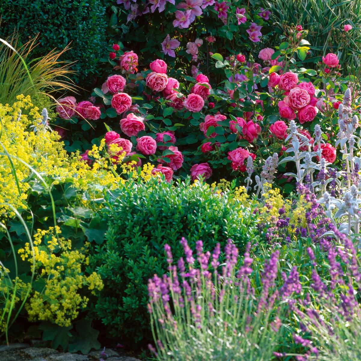 Willkommen im Rosenbeet „Blütenmärchen“! Das Set verzaubert Ihren Garten mit einer Vielfalt an Farben und Formen. Die majestätische Beetrose ‚Leonardo da Vinci®‘ bildet den Mittelpunkt dieses märchenhaften Zusammenspiels, umgeben von Wollziest, Frauenmantel, Lavendel und Japanischem Blutgras ‚Red Baron‘. Diese perfekt aufeinander abgestimmte Kombination lässt Ihren Garten in bunten Farben erstrahlen und schafft eine harmonische und gleichzeitig lebendige Atmosphäre. Das Set besteht insgesamt aus 10 Pflanzen: 2x Beetrose ‚Leonardo da Vinci®‘ | Rosa Hybriden 2x Wollziest | Stachys byzantina 2x Frauenmantel | Alchemilla mollis 3x Lavendel | Lavandula angustifolia 1x Japanisches Blutgras ‚Red Baron‘ | Imperata cylindrica