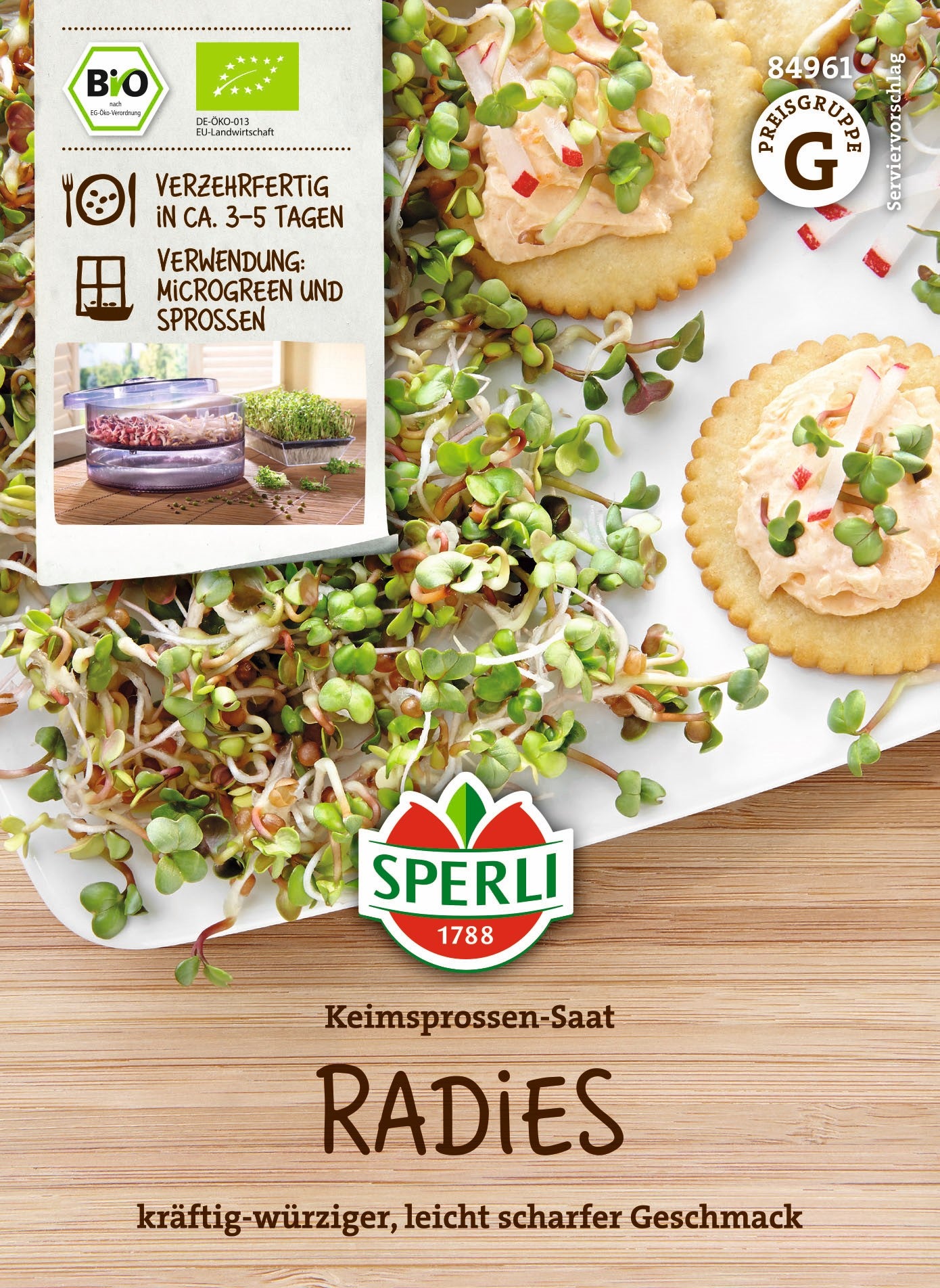 Mit den SPERLI BIO Keimsprossen-Samen Radies ziehen Sie innerhalb von 3 – 5 Tagen frische, gesunde und geschmackvolle Vitaminbomben heran. Sie erhalten BIO Keimsprossen-Samen Radies (Raphanus sativus), die mit ihrem kräftig-würzigen Geschmack mit leichter Schärfe perfekte Akzente in Salaten und als Brotaufstrich setzt. Mit unserer Keimsprossen-Saat erhalten Sie Samen, die sich ideal zum Keimen eignen. Geliefert werden nur die Samen – die frischen Sprossen ziehen Sie ganz einfach selbst in einem Einmachglas oder einer Keimschale. Nach wenigen Tagen Einweichen und regelmäßigem Spülen wachsen die Samen zu knackigen Sprossen heran, die Sie mit Wurzeln und allem Verzehrbaren direkt genießen können. Sprossen sind nicht nur sehr vielseitig, sondern auch sehr gesund. Sie stecken voller Vitamine, Mineralstoffe und Antioxidantien und eignen sich hervorragend als Garnierung für Salate, Sandwiches, Wraps, Suppen und vielen weiteren Gerichten. Pflege: Mit unseren Samen können Sie Keimsprossen ganz einfach und zuverlässig zu Hause ziehen. Wählen Sie ein Einmachglas, einen hellen Standort ohne direkte Sonneneinstrahlung und eine Umgebungstemperatur von mindestens 18 – 22 °C. Geben Sie ein bis zwei Esslöffel Samen in das Glas und bedecken Sie diese mit zimmerwarmem Wasser. Lassen Sie die Samen je nach Sorte einige Stunden einweichen. Gießen Sie anschließend das Wasser ab und spülen Sie die Samen gründlich durch. Geben Sie die Samen nach dem Abtropfen zurück ins Glas und verschließen Sie es mit einem Keimdeckel oder Tuch. Spülen und abtropfen sollten Sie die Keime zwei- bis dreimal täglich, um Schimmel zu vermeiden. Nach drei bis sieben Tagen, sobald sich kleine Blättchen zeigen, sind die Sprossen erntereif. Kippen Sie sie vorsichtig aus dem Glas, spülen Sie sie unter fließendem Wasser ab und genießen Sie sie frisch.