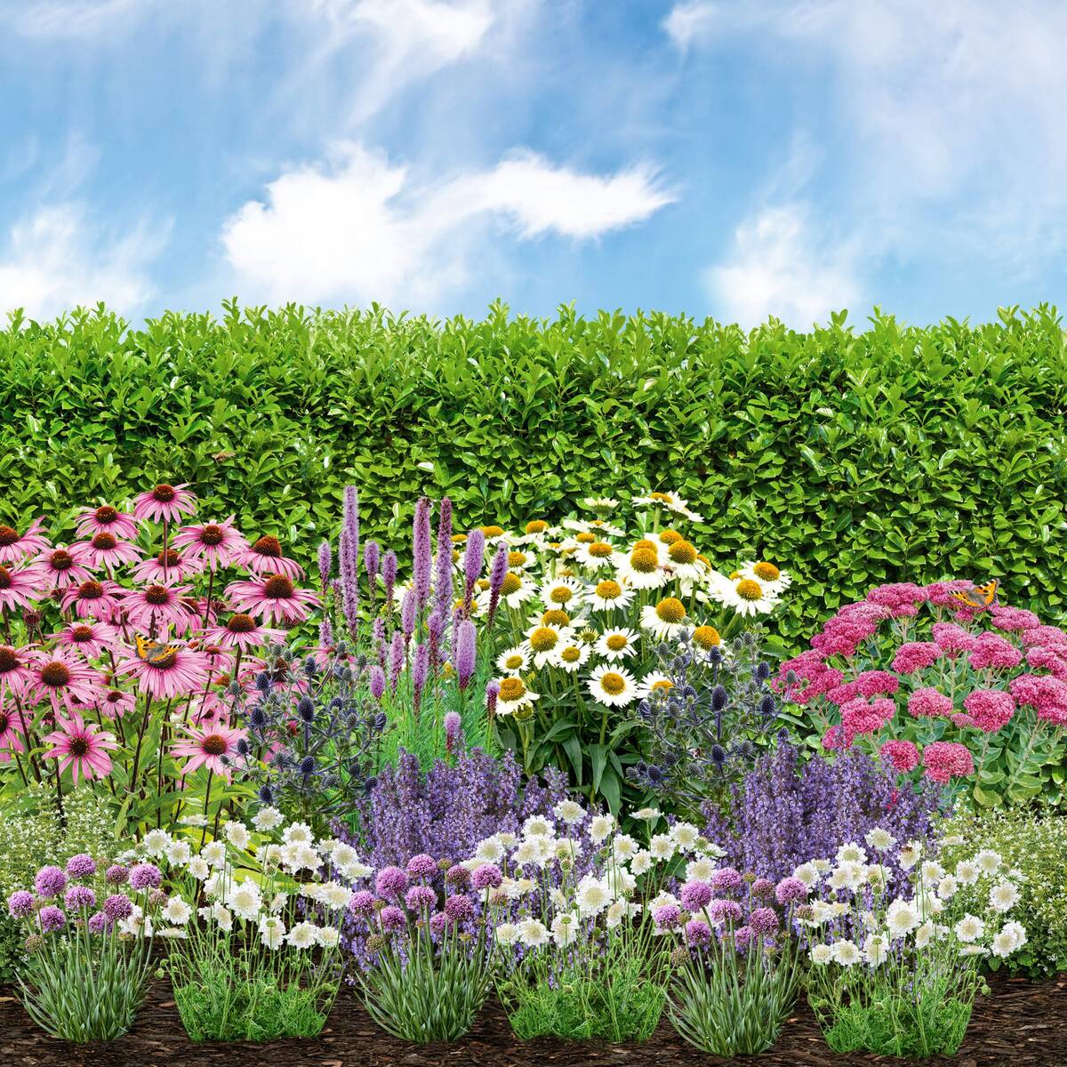 Tauchen Sie ein in das „Schmetterlingsglück im Spätsommer“ mit unserem exquisiten Staudenbeet-Set. Diese sorgfältig ausgewählten 16 Pflanzen sind nicht nur eine Augenweide, sondern auch eine Einladung an die Schmetterlinge, Ihren Garten zu beleben. Das Set ist für ein Beet mit folgenden Maßen geeignet: 3,0 x 1,0 m Die Pflanzen blühen im Spätsommer und schaffen so eine farbenprächtige Schmetterlingsoase. Jede Pflanze trägt dazu bei, einen harmonischen Gartenraum zu schaffen, während sie gleichzeitig die zarten Schmetterlingsflügel mit Nektar versorgt. Mit diesem Staudenbeet setzen Sie nicht nur auf visuelle Ästhetik, sondern fördern aktiv die Vielfalt der Schmetterlingswelt in Ihrem Garten. Das Beet besteht insgesamt aus 16 Pflanzen: Beet-Inhalt Botanischer Name Blütezeit 1x Purpur-Sonnenhut Echinacea purpurea Juli – September 2x Edeldistel ‚Blue Hobbit‘ Eryngium planum ‚Blue Hobbit‘ Juli – September 1x Prachtscharte ‚Kobold‘ Liatris spicata ‚Kobold‘ Juli – August 1x Weißer Purpur-Sonnenhut ‚Alba‘ Echinacea purpurea ‚Alba‘ Juli – September 1x Hohes-Fettblatt ‚Matrona‘ Sedum telephium ‚Matrona‘ August – September 2x Bergminze ‚Marvelette‘ Calamintha nepeta ‚Marvelette‘ Juli – September 3x Berg-Lauch Allium senescens Juli – September 3x Skabiose Scabiosa caucasica Juni – Oktober 2x Katzenminze Nepeta faassenii Mai – September Hinweis: In Ausnahmefällen kann es dazu kommen, dass die Zusammensetzung des Beetes aufgrund von unterschiedlichen Verfügbarkeiten der einzelnen Pflanzen leicht abweicht. Dabei erhalten Sie ein zum Beet passendes und qualitativ gleich hochwertiges Ersatzprodukt.