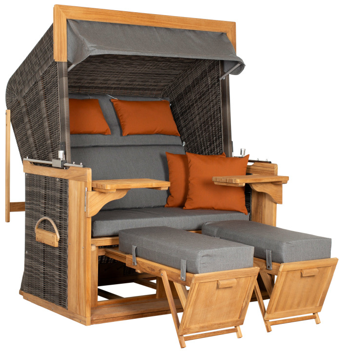 Ein Ort zum Durchatmen und Abschalten Wenn der Wind leise durch die Blätter streicht und die Sonne goldene Akzente auf Ihre Terrasse malt, wird jeder Moment im Freien zu etwas Besonderem. Der Strandkorb deVries PURE® Friesland Sylt XXL PE stone grey Des. 852 schafft genau diesen Raum – elegant, komfortabel und mit spürbarer Liebe zum Detail. Design, Materialien & Verarbeitung Der Strandkorb deVries PURE® Friesland Sylt XXL PE stone grey Des. 852 überzeugt durch seine harmonische Verbindung aus natürlichem Teak-Holz und einem widerstandsfähigen PE-Geflecht in modernem stone grey. Das 6 mm starke Geflecht ist nicht nur pflegeleicht, sondern auch witterungs- und UV-beständig – ideal für den Einsatz im Garten oder auf der Terrasse. Die verzinkten Beschläge fügen sich dezent in das Design ein und garantieren zusätzliche Stabilität. Mit seinen großzügigen XXL-Maßen lädt dieser Strandkorb zum ausgedehnten Verweilen