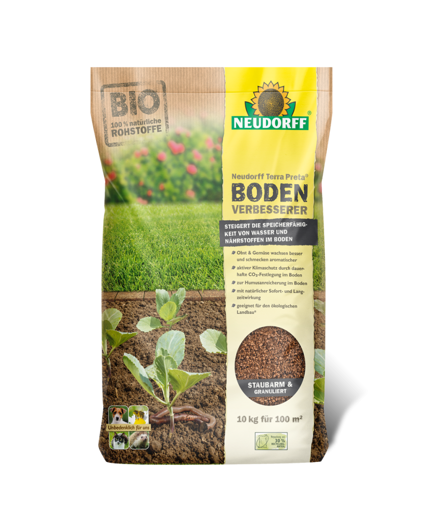 Neudorff Terra Preta BodenVerbesserer Verbessern Sie Ihren Gartenboden nachhaltig Die Rasengräser schwächeln, Obst, Gemüse, Gehölze und Stauden wachsen nicht mehr so recht? Zeit, den Boden zu verbessern. 100% Neudorff Terra Preta zur Humusanreicherung im Boden Rasenflächen werden belastbarer Obst & Gemüse wachsen besser und schmecken aromatischer aktiver Klimaschutz durch dauerhafte CO²-Festlegung im Boden mit natürlicher Sofort- und Langzeitwirkung Geeignet für den ökologischen Landbau* *lt. Verordnung (EU) 2018/848 Anwendung: Neuanlage (gilt für alle Kulturen): einmalig 500 g/m² Rasen: 100-150 g/m² 1x jährlich im März/April oder September ausbringen Beet: 100-150 g/m² 1x jährlich vor der Aussaat/Pflanzung ausbringen Stauden: 100 g/m² 1x jährlich im März/April ausbringen Obst- und Beerensträucher: 100-150 g/m² 1x jährlich im März/April ausbringen Gemüse: 150 g/m² 1x jährlich vor der Aussaat/Pflanzung ausbringen Extra-Tipp: Bei sehr schlechten Bodenverhältnissen sollten die Aufwandmengen verdoppelt werden. Der Neudorff Terra Preta BodenVerbesserer ist ein organisch-mineralischer NPK- Dünger, der für alle Böden und Kulturen geeignet ist. Die Inhaltsstoffe Bio-Pflanzenkohle, organisches Material und Mikroorganismen sorgen für einen aktiven Humusaufbau, der den Boden nachhaltig verbessert. Das staubarme Granulat ermöglicht zielgerechte Ausbringung mit dem Streuwagen oder per Hand. Unbedenklich für Haustiere, Nützlinge und Menschen. Ressourcenschonend in Deutschland produziert.
