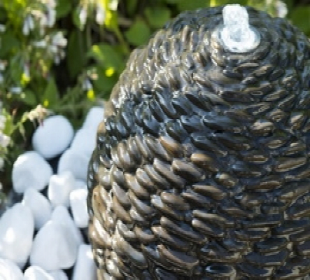 Wasserbrunnen Wasserornamente Kugel gesetzt mit Naturstein in der Farbe dunkelbraun. Inklusive Abdeckplatte, Tank, Pumpe und LED-Beleuchtung.